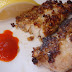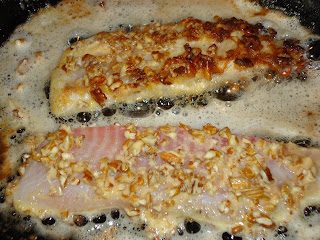 | dry Tilapia filet with paper towel, salt and pepper it, then dunk in batter, afterwards sprinkle chopped pecans on the top and bottom of filet |